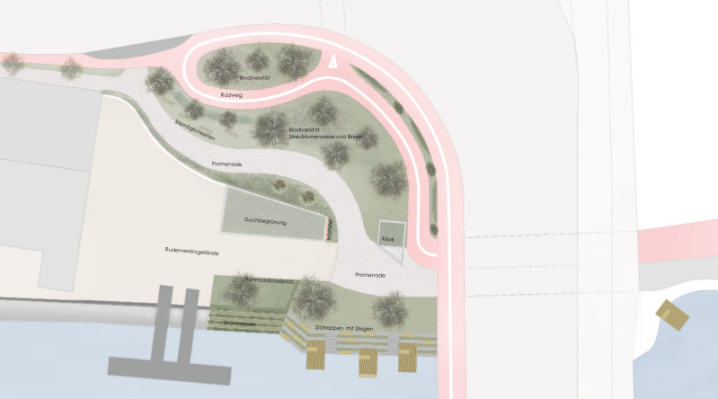 Der Fußweg soll so als Seepromenade in Richtung des Konstanzer Wirtshauses weitergeführt werden. Der Platz zwischen Fuß- und Radweg soll eine Art „Inselbiotop“ bilden, auf dem verschiedene Blumen, Gräser, Hecken und Bäume wachsen. Auf Sitztreppen oder einem der Stege kann man bei einem gemütlichen Feierabendbier, vom angrenzenden Kiosk, den Sonnenuntergang am Untersee beobachten. Durch den Kiosk soll der Platz zusätzlich belebt werden und den Spaziergängern eine Anlaufstelle bieten. Das Grundstück des Rudervereins soll durch eine stärkere Begrünung qualitativ aufgewertet werden. Bäume und Sträucher bilden eine natürliche Trennung zwischen den Sitztreppen und dem Grundstück des Rudervereins. Die Fassade des Bootsschuppens soll ebenfalls begrünt werden um sich besser in das Umfeld einzufügen. Infotafeln am Schuppen sollen Aufschluss geben, über den Rheinkilometer 0, sowie die Rheinbrücke.